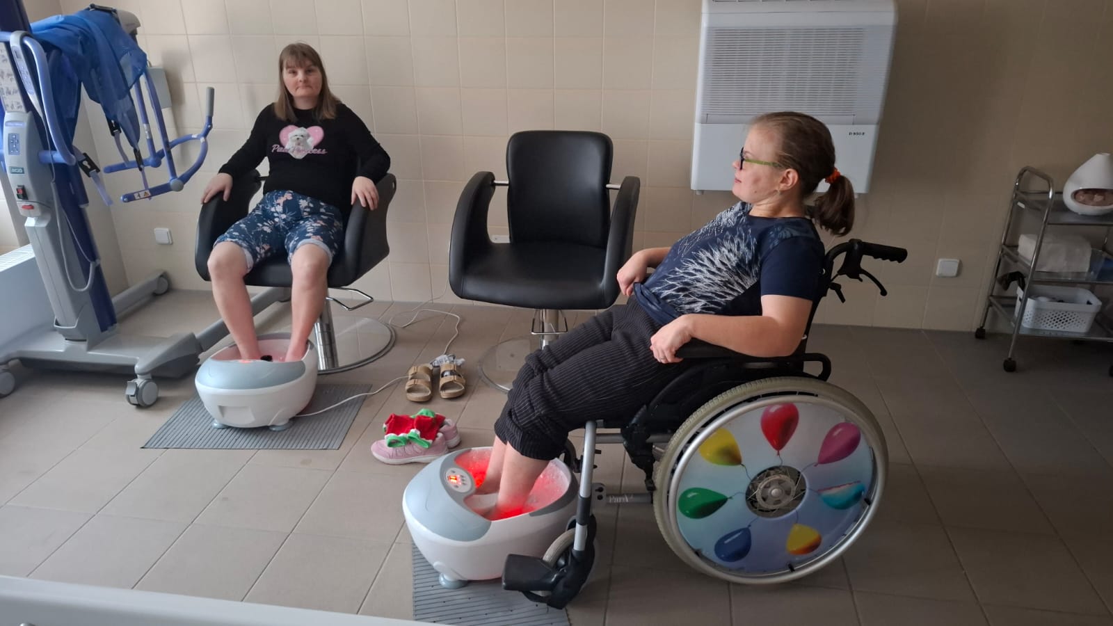 Klienti si pohodlně sedli a ponořili nohy do perličkových vaniček s teplou vodou, kde proudící bublinky jemně masírovaly chodidla. Koupel přispívá k uvolnění svalů, podporuje prokrvení dolních končetin a navozuje pocit pohody. Perličková koupel nohou je zároveň vhodnou smyslovou a relaxační činností, která pomáhá klientům vnímat vlastní tělo, uvolnit napětí a zpomalit tempo. Pro některé je to také důležitý prvek v oblasti péče o nohy a prevence diskomfortu.