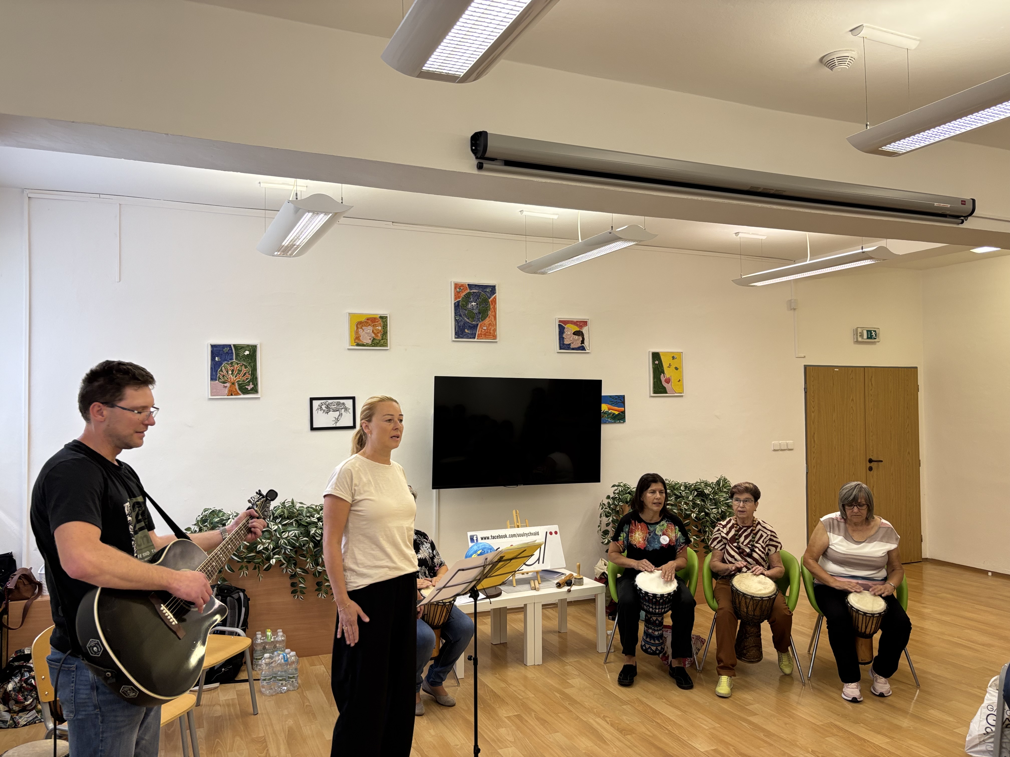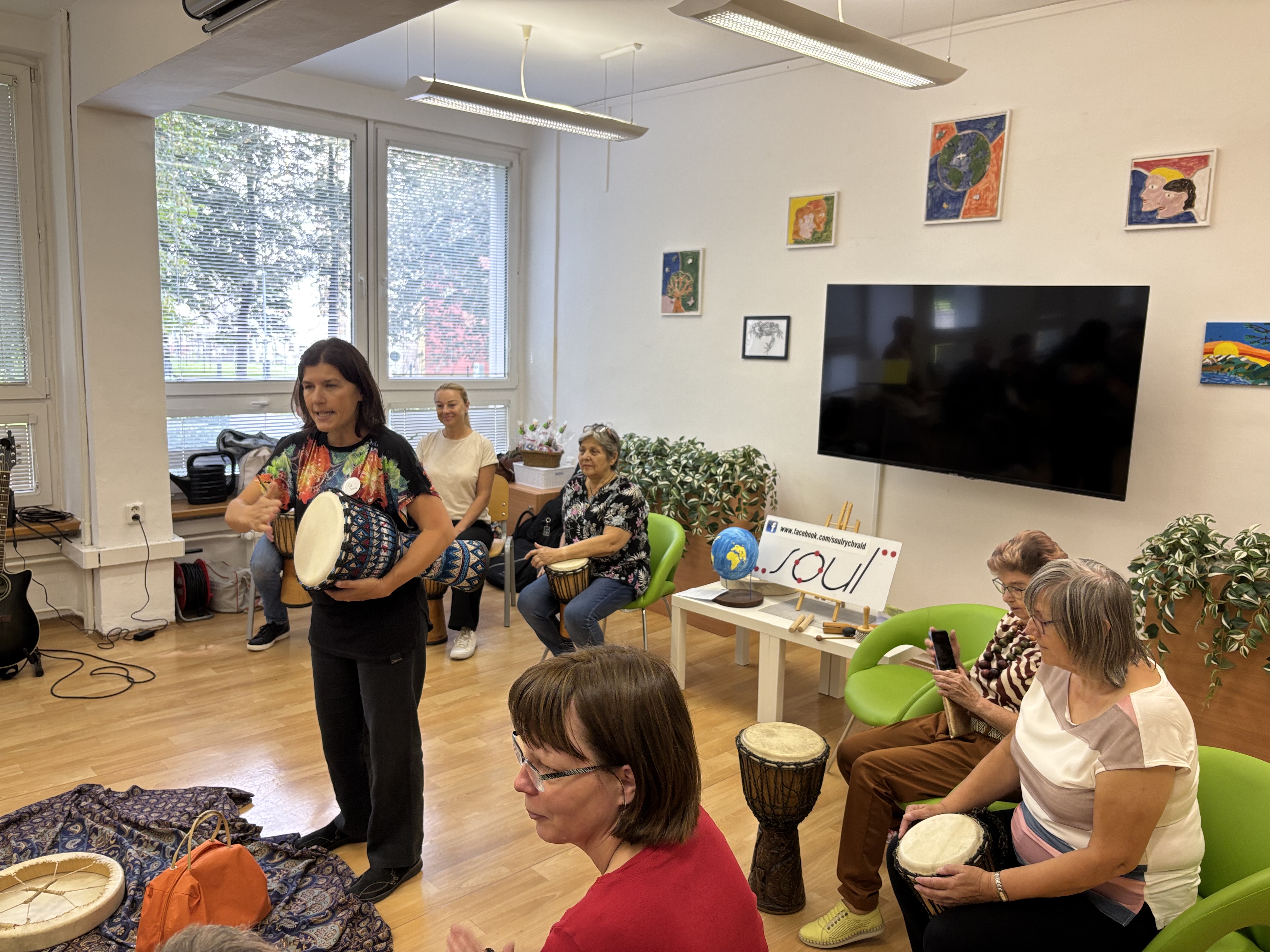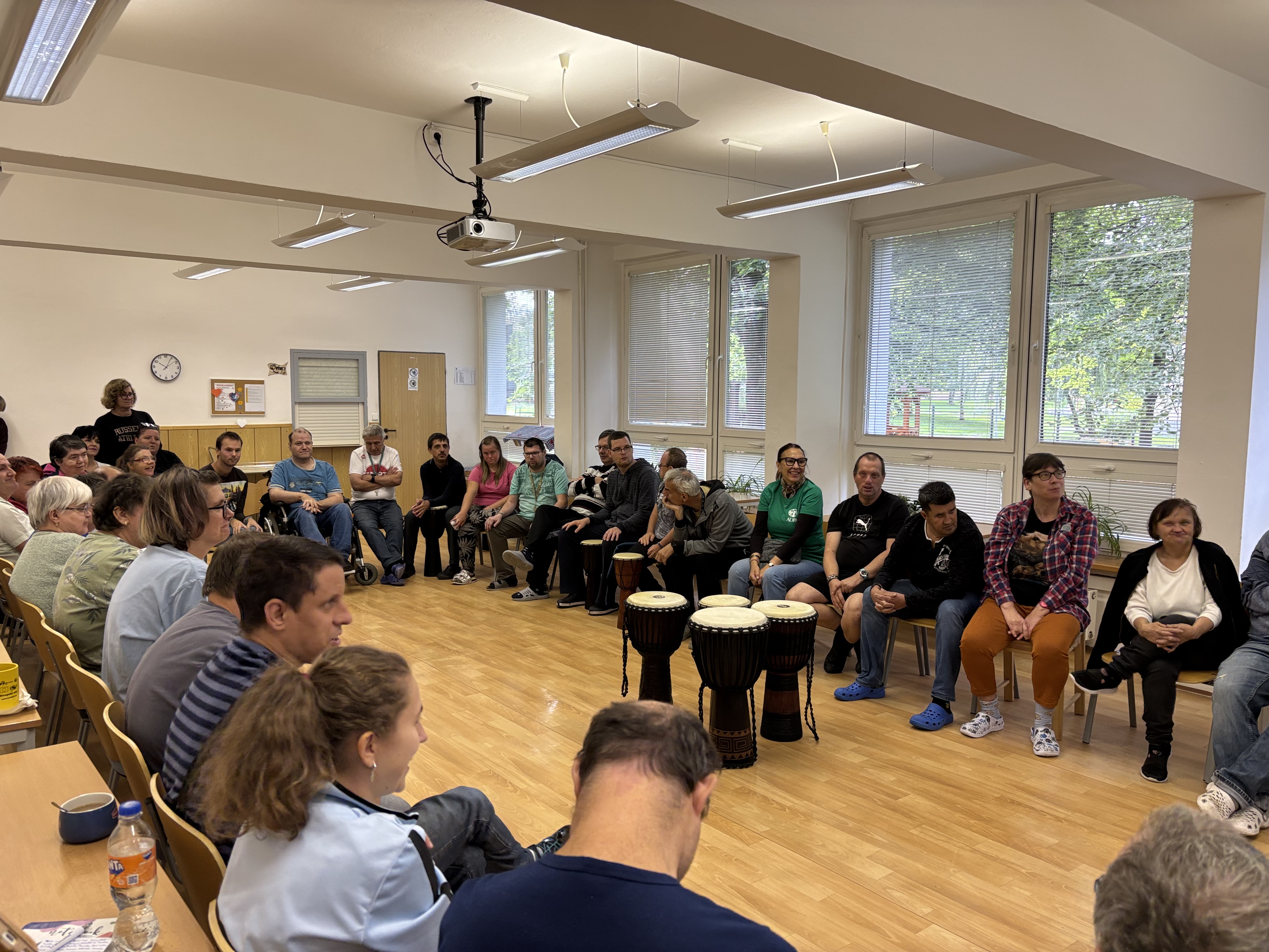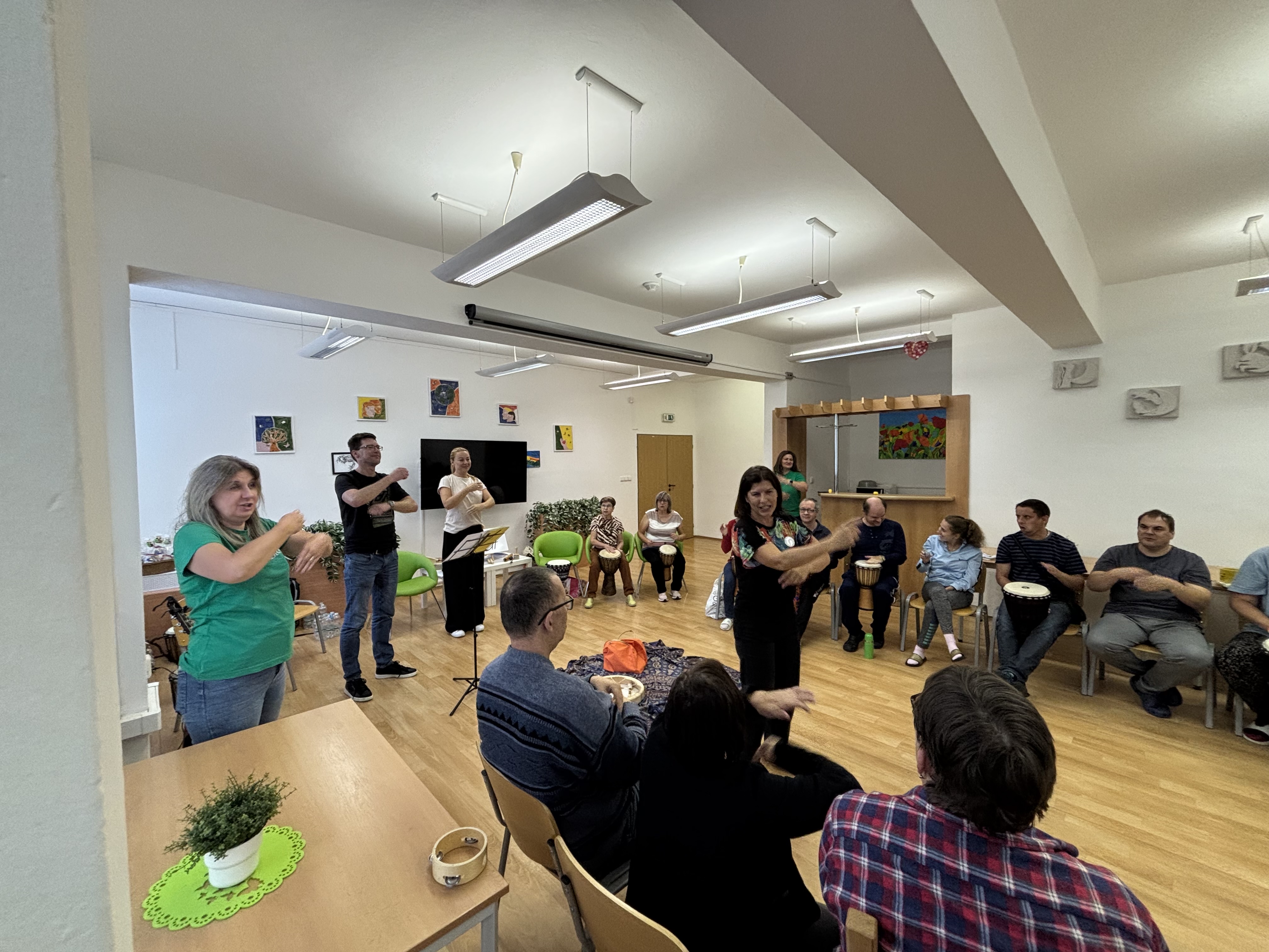 Ve čtvrtek 18. září 2025 proběhlo na středisku MIKADO hudební dopoledne se skupinou Soul Rychvald a dobrovolníky z Adry. Klienti si mohli vyzkoušet různé rytmické techniky bubnování a aktivně se zapojit do hry.
