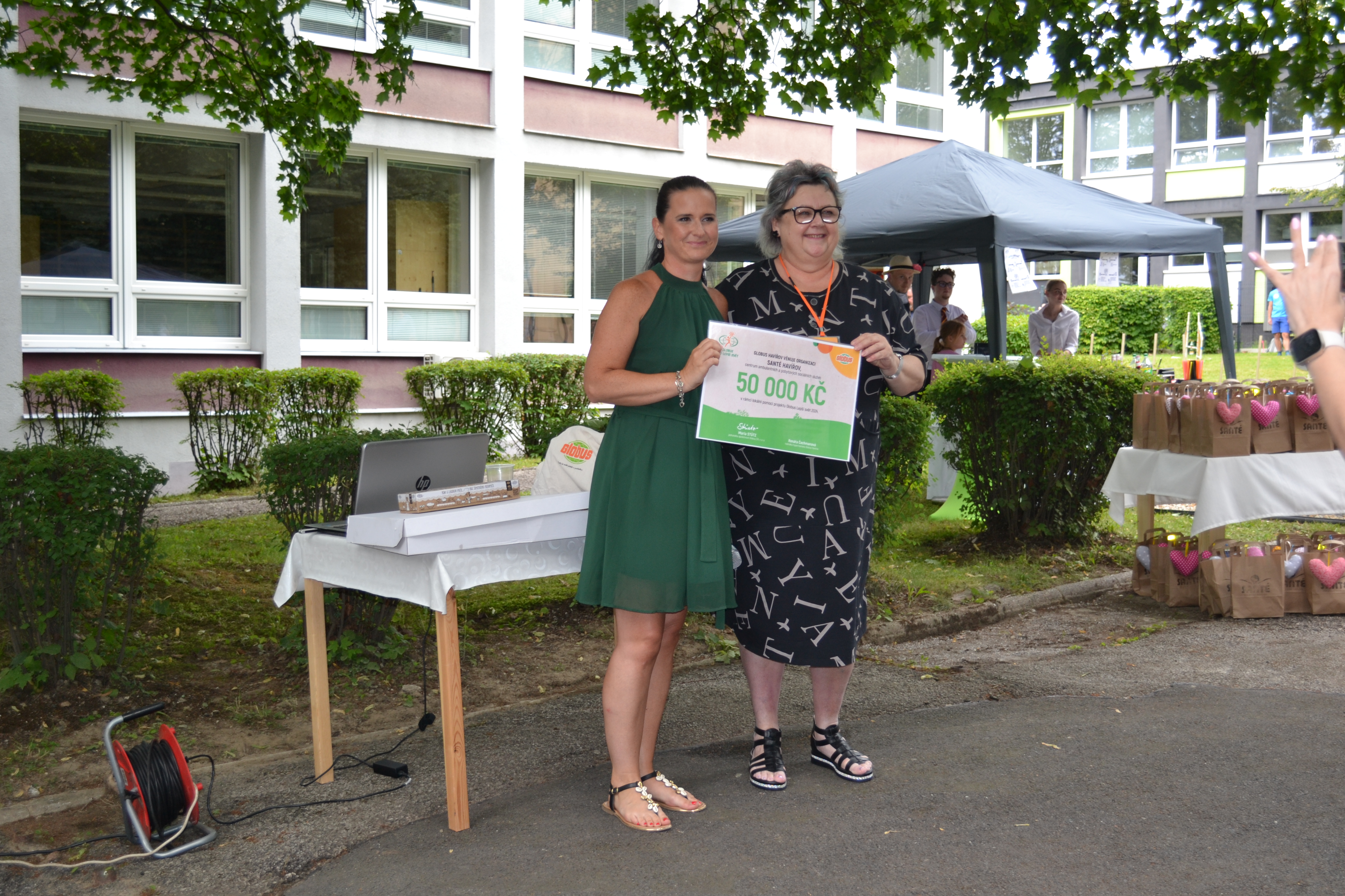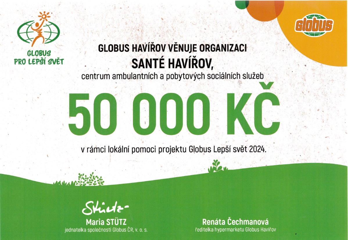 V pondělí 24.06.2024 slavnostně převzala paní Mgr. Michaela Rosová, ředitelka organizace SANTÉ – centra ambulantních a pobytových a sociálních služeb, z rukou paní Renáty Čechmanové, ředitelky hypermarketu Globus Havířov, finanční šek na částku 50.000,-Kč. Díky podpoře projektu Globus Lepší svět 2024, může organizace zajistit hipoterapii a canisterapii pro klienty SANTÉ.