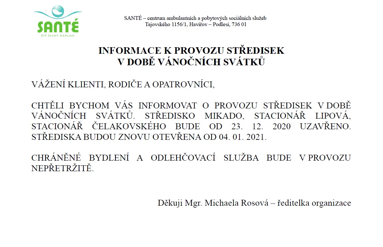 Posláním příspěvkové organizace SANTÉ - centrum ambulantních a pobytových sociálních služeb je poskytování kvalitních sociálních služeb lidem s mentálním postižením tak, aby mohli i při jejich užívání vést co nejsamostatnější život.