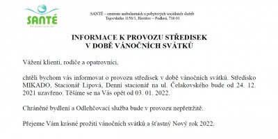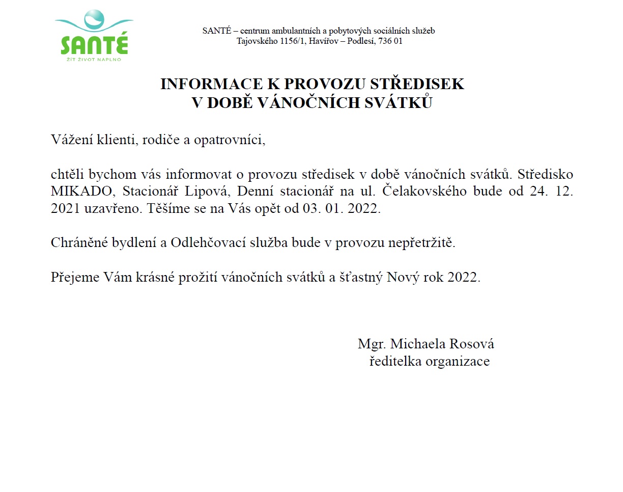 Posláním příspěvkové organizace SANTÉ - centrum ambulantních a pobytových sociálních služeb je poskytování kvalitních sociálních služeb lidem s mentálním postižením tak, aby mohli i při jejich užívání vést co nejsamostatnější život.