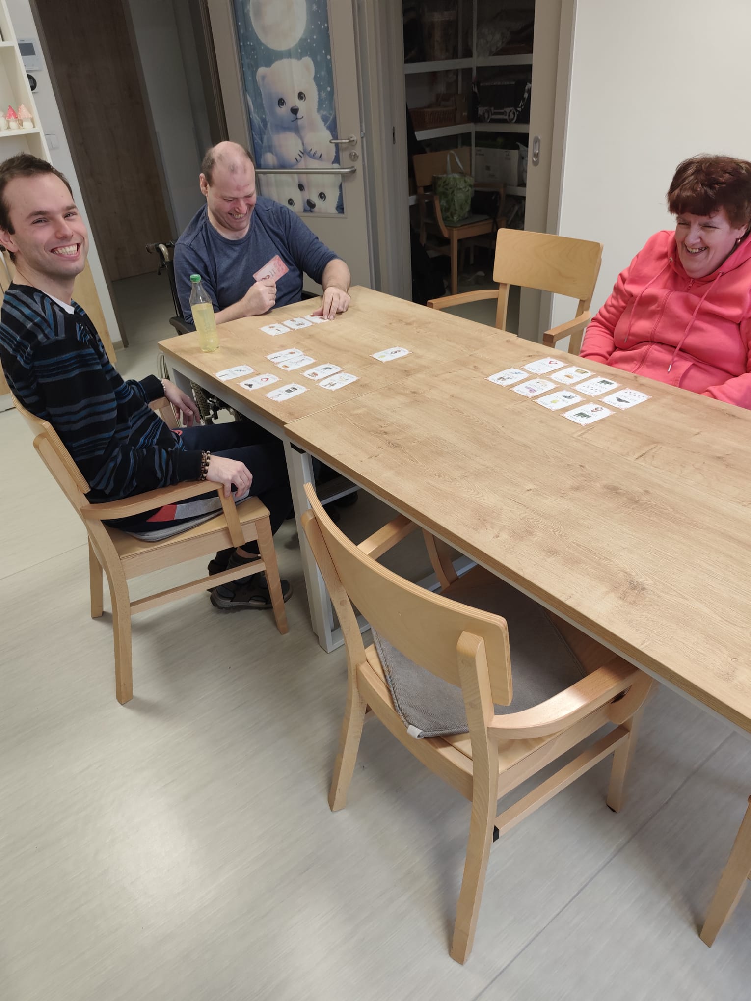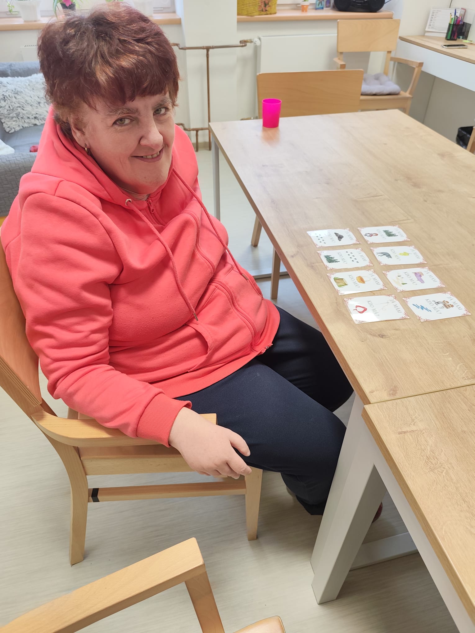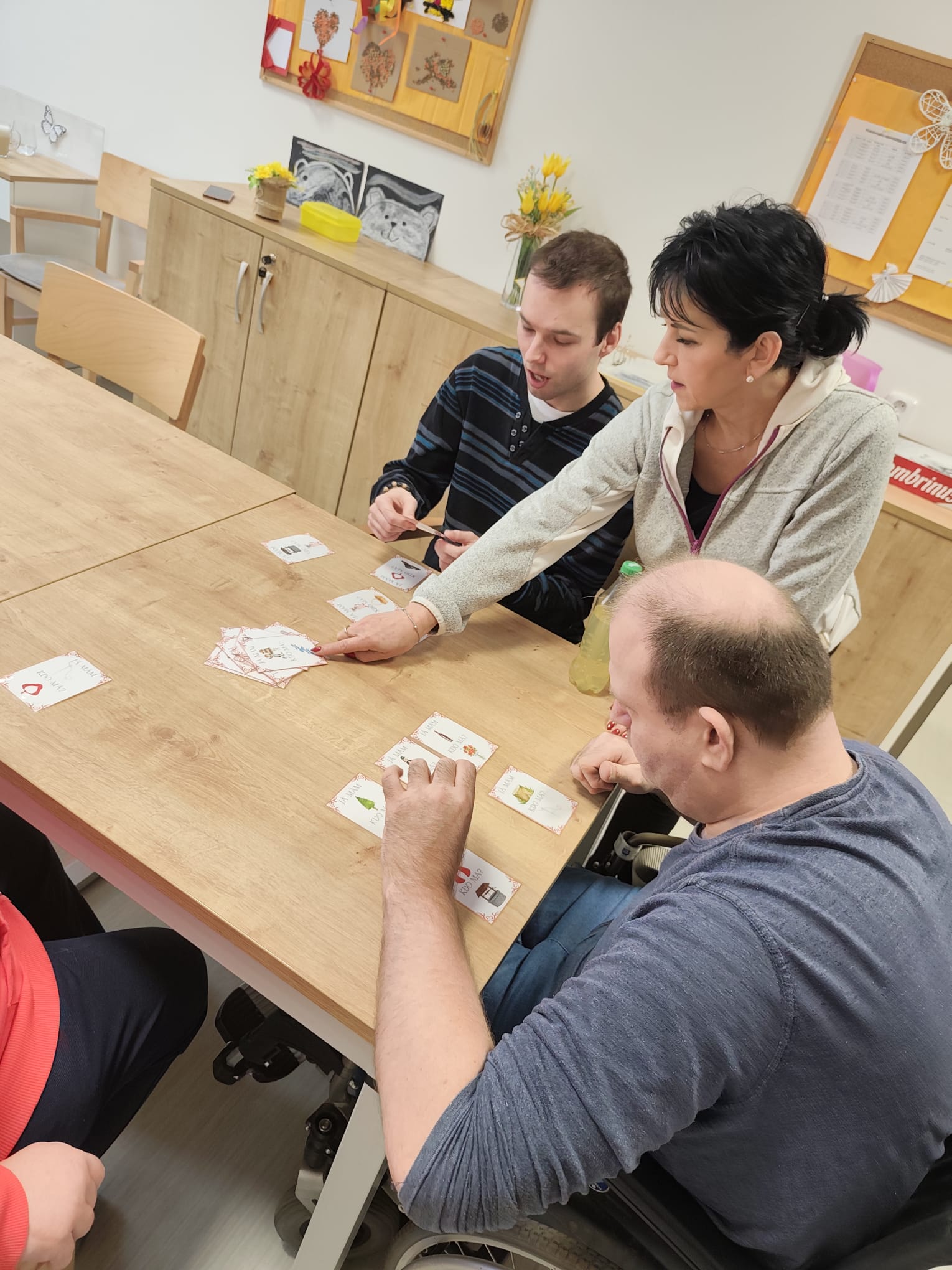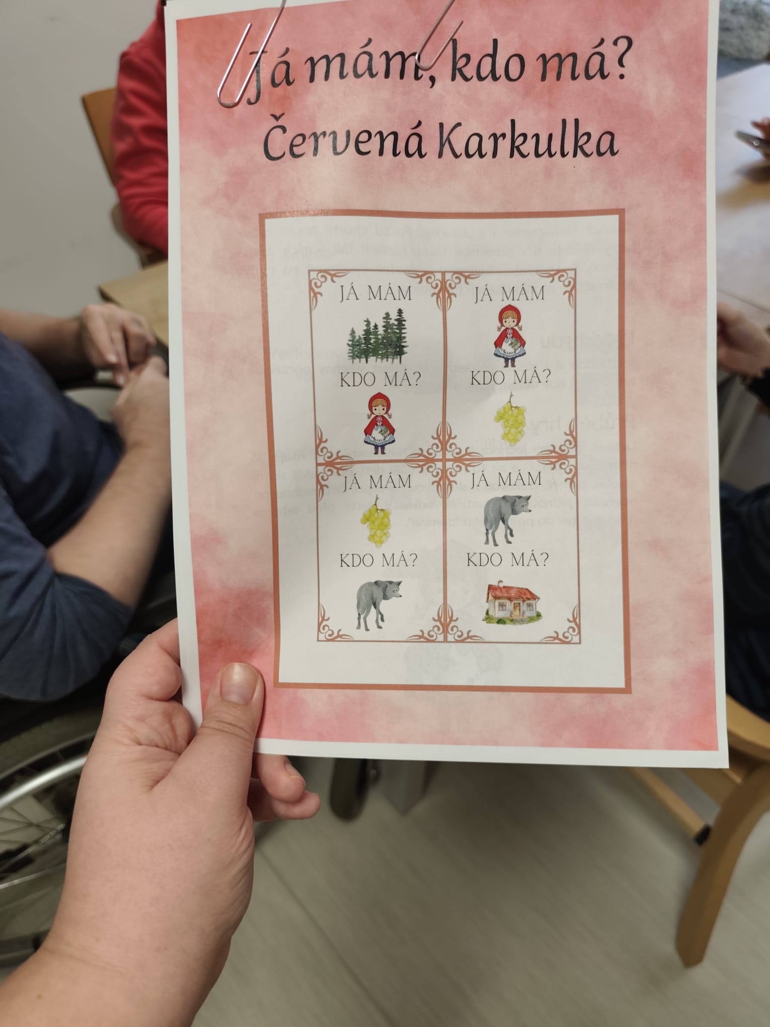 Znáte hru Já mám kdo má ? Pravidla jsou taková: Každé dostane jednu kartu. První řekne, co má na obrázku, třeba “Já mám ježka” a zeptá se kdo má obrázek pod ním “Kdo má zajíčka”. Na otázku reaguje ten, které má zajíčka. Výsledkem hry je, že se postupně vytváří navazující řada (živé domino).
