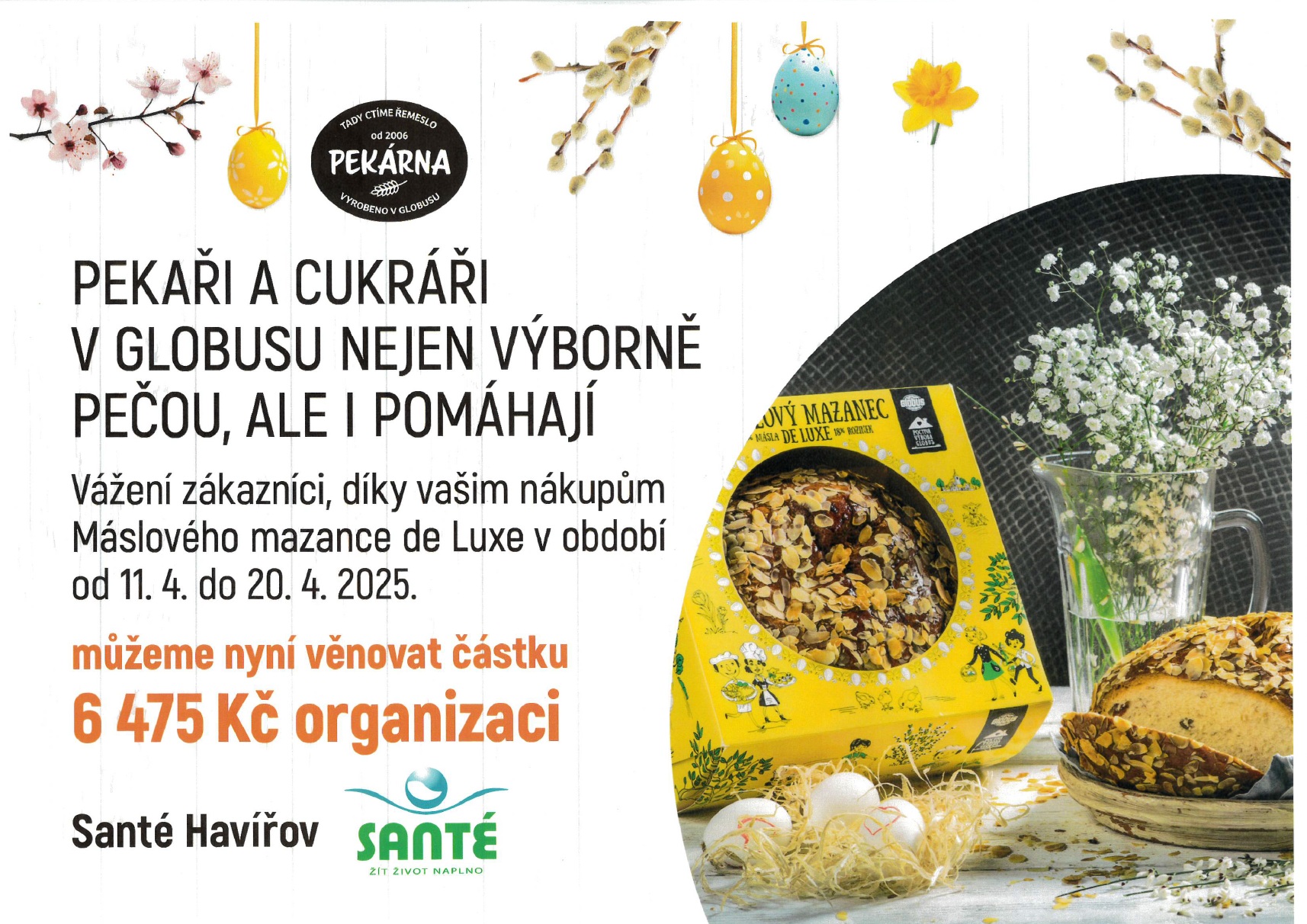 Další podporu přinesla prodejní akce, která probíhala v Globusu Havířov v dubnu 2025. Z každého prodaného velikonočního mazance bylo věnováno 25 Kč ve prospěch SANTÉ Havířov. Celkem se v rámci této akce podařilo vybrat 6 475 Kč.