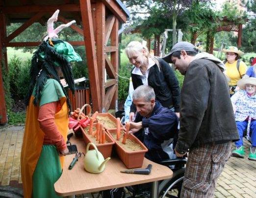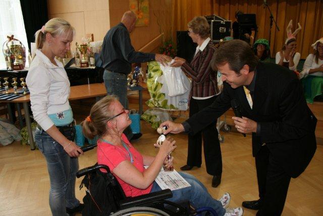 Tříčlenné družstvo našich klientů se vydalo 9.9.2011 na VX. Mezinárodní sportovně společenské hry vozíčkářů. Tyto hry se konaly v Domově Slunečnice v Ostravě. Po přívětivém přijetí a úvodním zahájení tamních zaměstnanců i klientů v maskách včel, krtků i zahradníků, začaly družstva mezi sebou zápolit v různých soutěžích na téma: „Šel zahradník do zahrady“. Po zajímavých soutěžích (zazimování mrkve, plašení krtka, sklizeň brambor) všichni netrpělivě čekali na vyhlášení výsledků. Naše družstvo se sice neumístilo na předních pozicích, ale odměna nás neminula. Hana Nevrlá získala ocenění Největší sympaťačka her. Měli jsme dobrý pocit ze sportovně prožitého dne, hry fair-play a seznámení s novými lidmi. Kateřina Slezáková |
