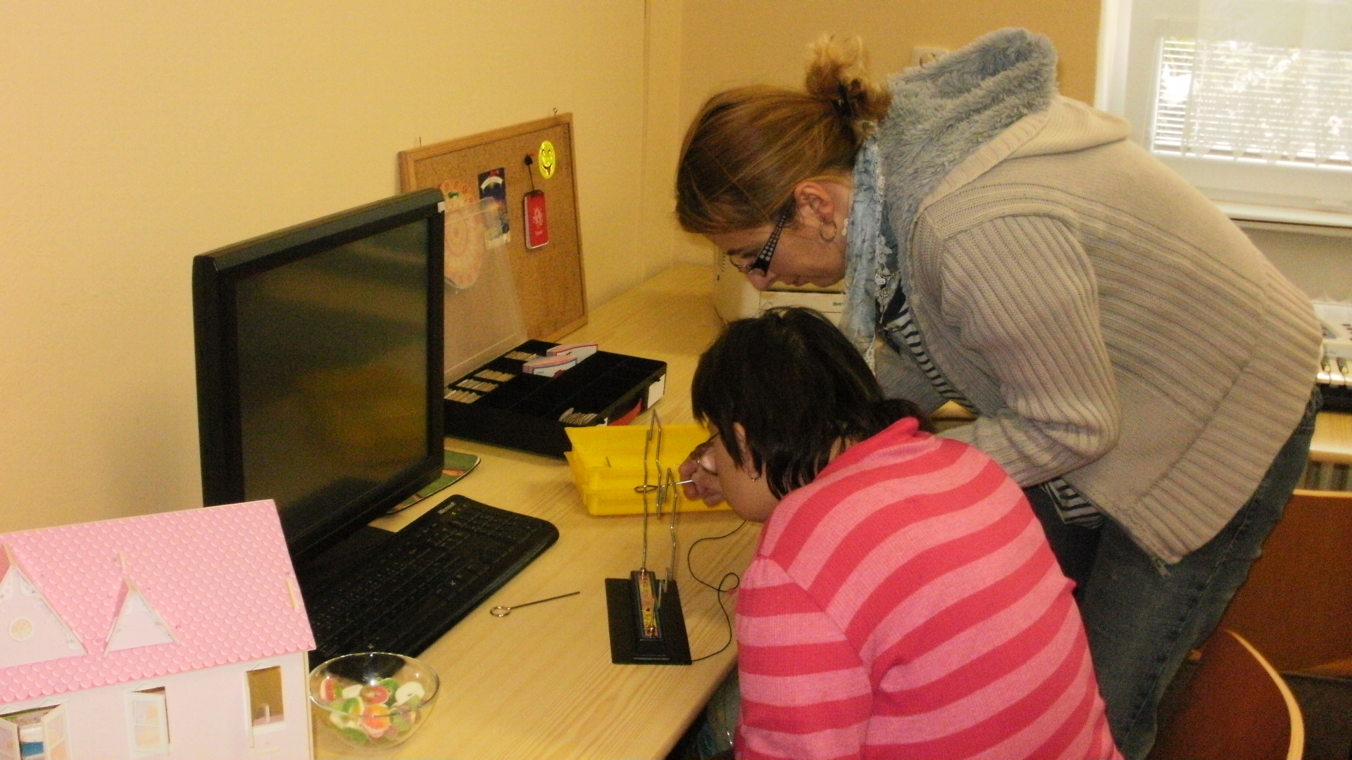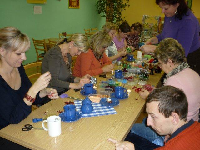 Návštěvníkům byli k dispozici zaměstnanci, kteří jim poskytovali základní informace o sociálních službách, které naše organizace nabízí a poskytuje. Měli možnost nahlédnout do kronik jednotlivých středisek organizace, odnést si informační letáky i drobné upomínkové dárky nebo si zakoupit výrobky našich klientů. Rovněž jsme návštěvníkům nabídli i možnost vyzkoušet a zhotovit si za pomocí zaměstnanců pletený košík z papíru, ozdobný zápich do květináče, náramky z plastu, korálků, ozdobné magnety, ubrouskovou techniku apod. Vyrobené předměty si mohli odnést domů a pochlubit se svou zručností.