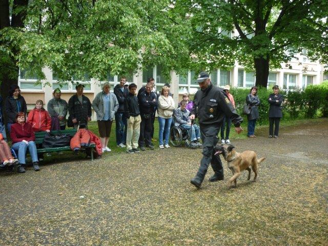 Výcvik policejních psů byl pro uživatele organizace SANTÉ – centrum ambulantních a pobytových sociálních služeb velkou událostí. Policisté předvedli se psy nejdříve poslušnost. Po celou dobu ukázky nezazněl povel, který by zůstal bez reakce jeho čtyřnohého pomocníka. Zejména v těchto chvílích bylo patrno, jak úzký vztah mají mezi sebou policejní psi a jejich cvičitelé. Velkým zážitkem pro uživatele byly ukázky obrany a zásahu psů. Nejvíce nás zaujaly simulace různých situací, včetně rozvášněného fotbalového davu, který jsme pomohli vytvořit. Policisté akci doprovázeli odborným výkladem o své profesi a zodpověděli všechny zvědavé otázky, týkající se jak výcviku psů, tak policejní práce. Děkujeme vstřícnému přístupu vedení i zaměstnancům městské policie.