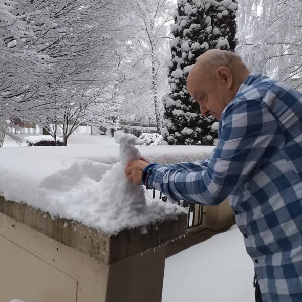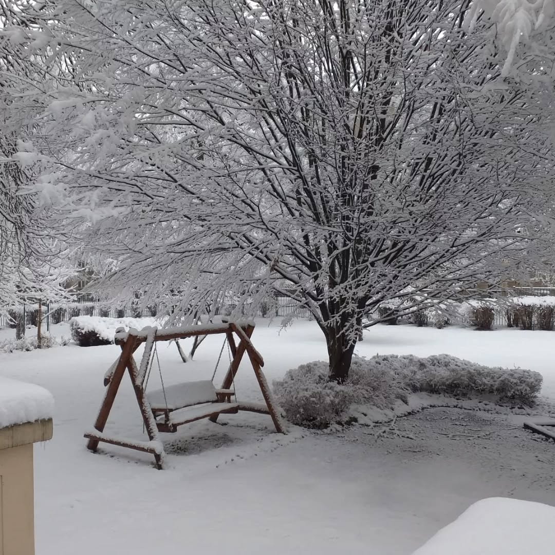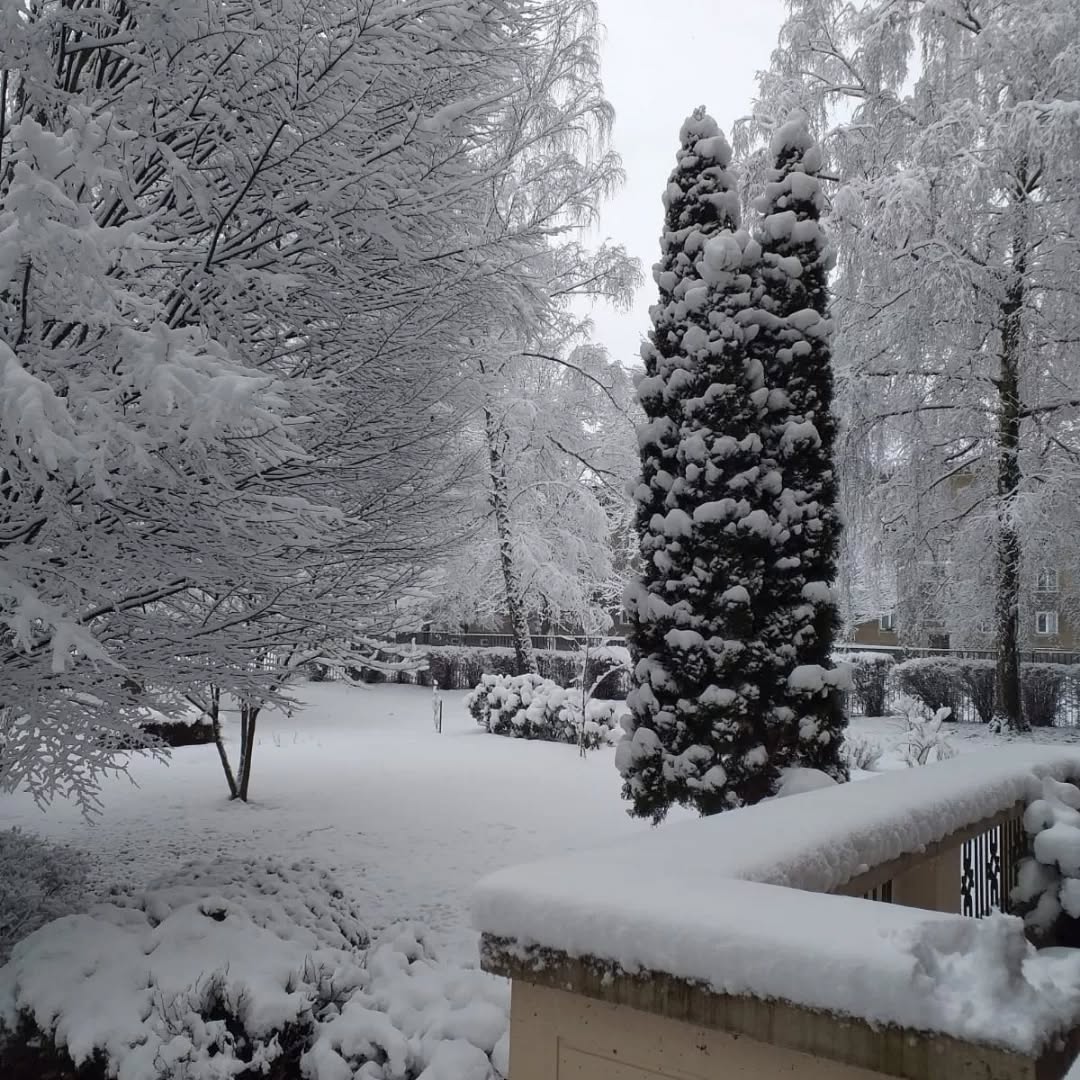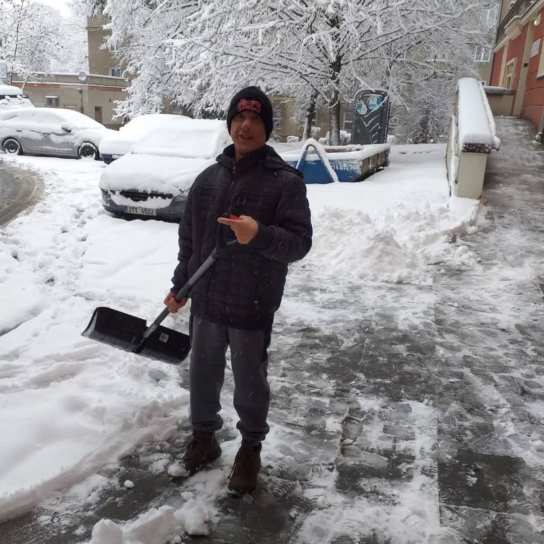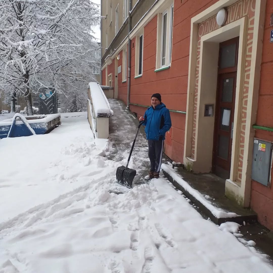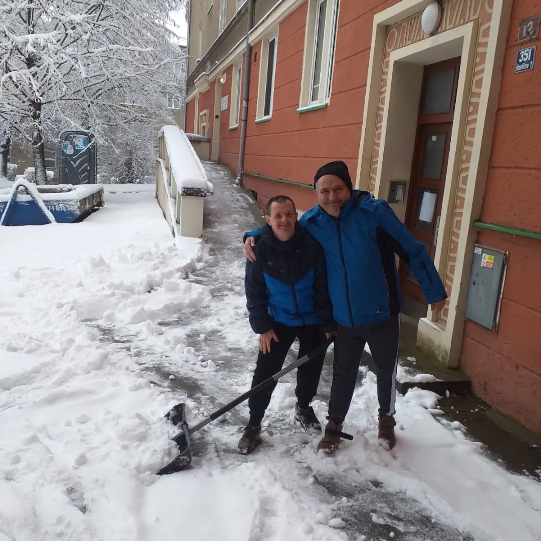 Zasněžená zahrada na chráněném bydlení o víkendu lákala i ke stavbě sněhuláka.